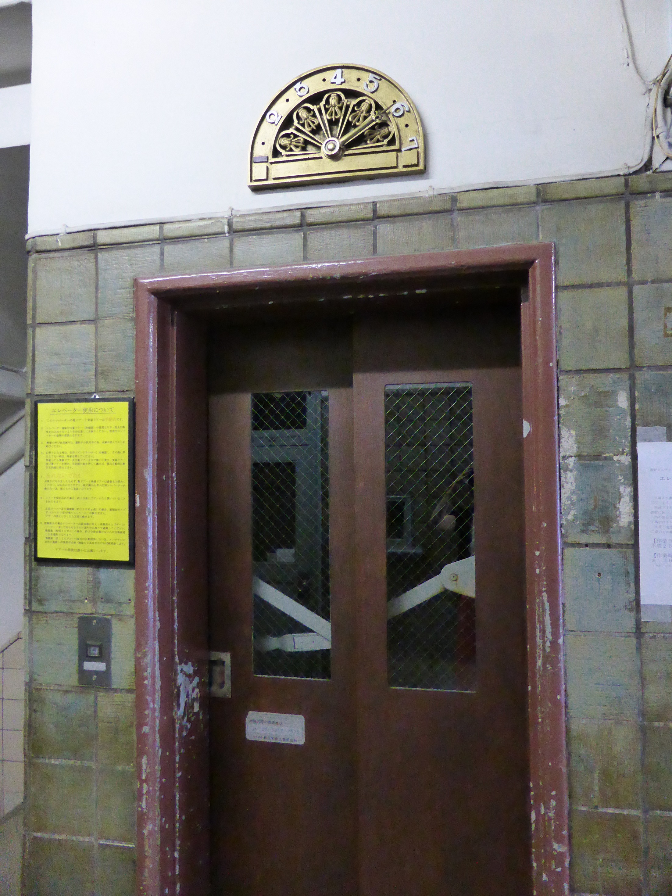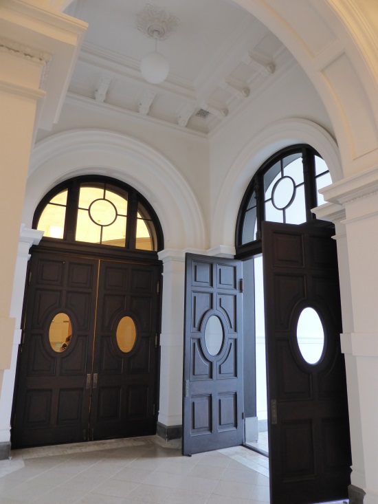 左の扉を開くとミュージアムへと続きます。取っ手に”おす登あく”(押すと開く)とプレートがありまして、手で押して開く扉がまだ少なかった時代のことで、このやうに説明が添えられているそうです。右の扉を開くと途中、パーティーでも開けそうな、広々とした贅沢な踊り場を抜けて外へ続きます。真夏の、思わず目を細めるやうな強い日差しの中、目に飛び込んできたのは豪奢で立派なメダリオンでした。