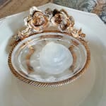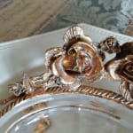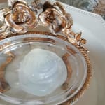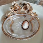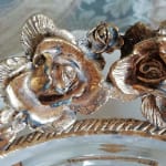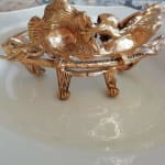 薔薇の真鍮の土台の上にガラスのトレーをのせた重厚感のあるソープトレーです。ガラスはくもりあり、彫りが綺麗です。真鍮はハゲ、汚れあり、真ちゅうのハゲた朽ち具合がノスタルジックで素敵です。石鹸をおいても、アクセサリーをおいても色々楽しめます。古い物への理解ある方にお勧めいたします。