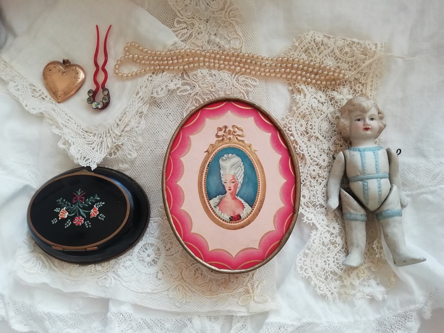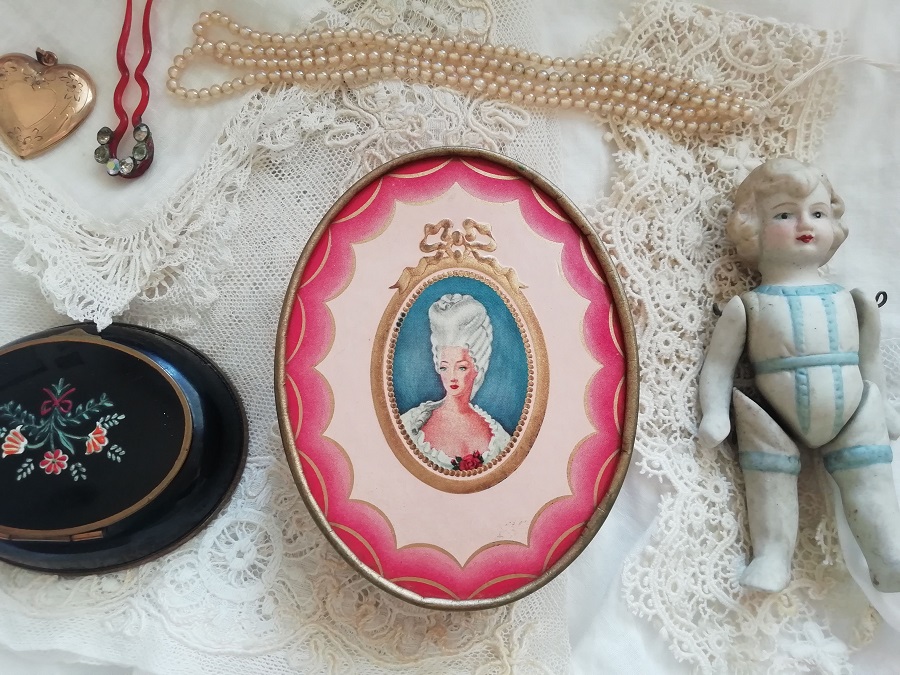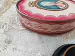 紫おびたピンクの色味が60年代らしいVintageのパウダーボックスです。サテンのリボンつきのふわふわパフは未使用。蓋をあけるとピンクのプラスチックの容器、パウダーは入っておりませんが、ほのかな残り香にうっとりします。たくさんのレースを無造作に入れてのぞかせたらガーリッシュです。ドレッサーやバスルームなど、ブードワーをクラシカルに装えます。