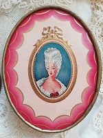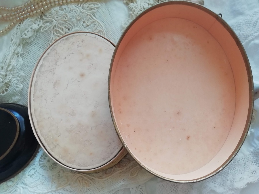 " Richard Hudnut "と呼ばれるブランドで、No.V046と同じものです。フェースパウダーが入っておりまして、未開封です。紙箱の蓋を開けるとプラスチックの透明な中蓋でしっかり閉じられてますので、パウダーがもれてしまうということはありません。淡いピンク色のグラデーションとリボンの中にロココな美女が描かれて素敵です。