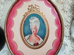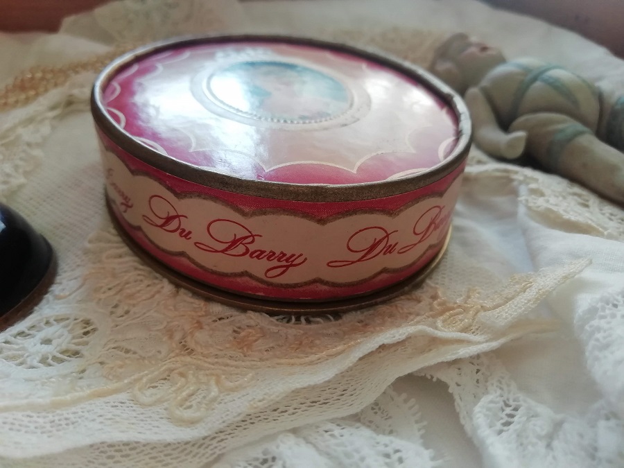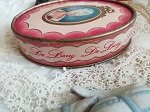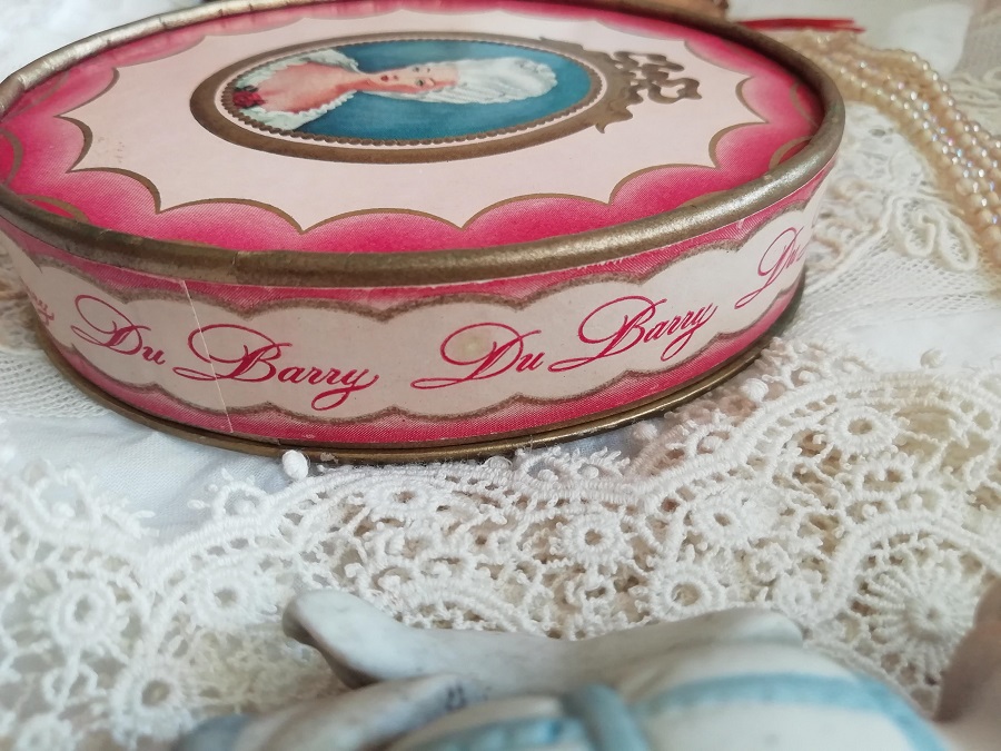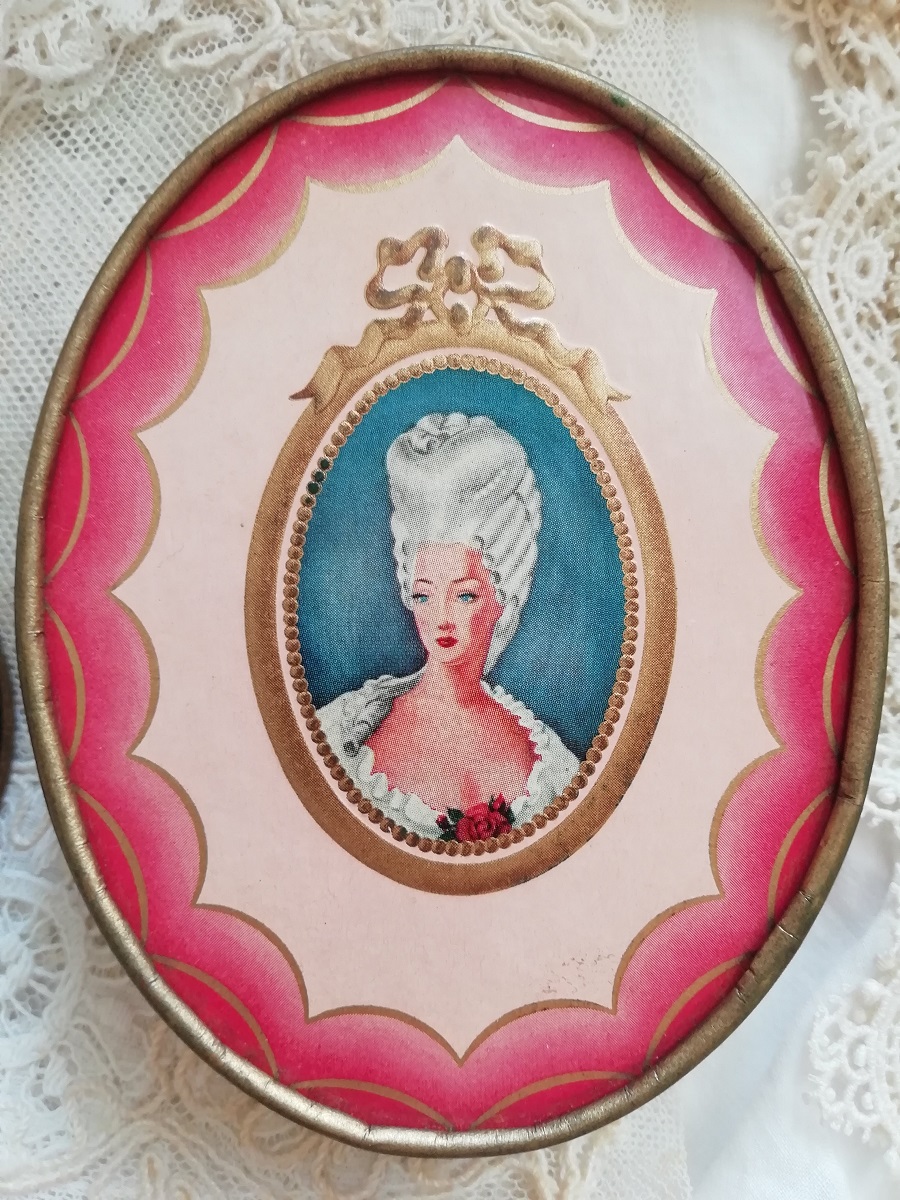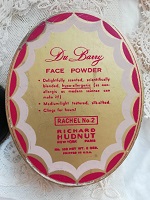 " Richard Hudnut "と呼ばれるブランドで、No.V046と同じものです。フェースパウダーが入っておりまして、未開封です。紙箱の蓋を開けるとプラスチックの透明な中蓋でしっかり閉じられてますので、パウダーがもれてしまうということはありません。淡いピンク色のグラデーションとリボンの中にロココな美女が描かれて素敵です。